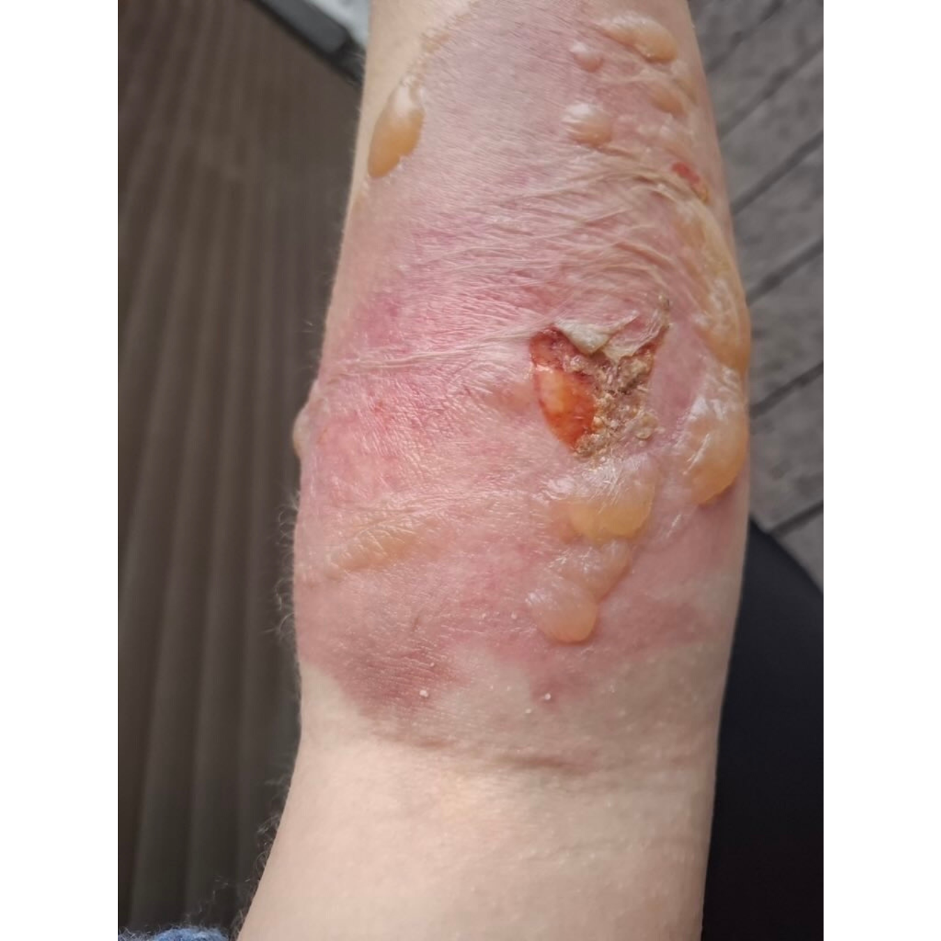 Within hours of the incident, multiple tense blisters developed over a red, swollen base-consistent with a deep partial-thickness (second-degree) thermal burn covering an estimated 6 × 8 cm area. The burn was extremely painful and showed no signs of infection at presentation.