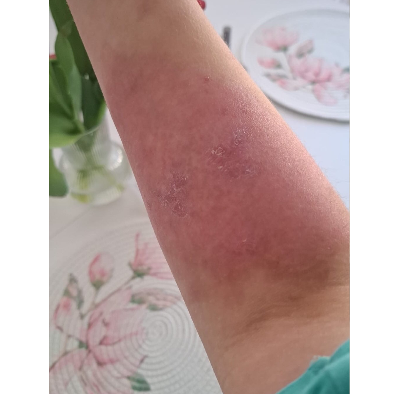 W ciągu kilku godzin od oparzenia na zaczerwienionej i obrzękniętej skórze pojawiły się liczne napięte pęcherze – obraz typowy dla oparzenia II stopnia (głębokiego częściowego) o powierzchni ok. 6 × 8 cm. Oparzenie było bardzo bolesne, bez objawów infekcji w momencie rozpoczęcia leczenia.